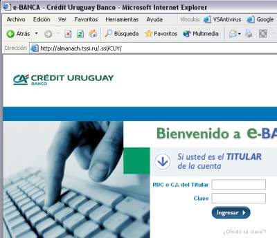 En concreto, el usuario ve un acceso a una supuesta dirección de la institución financiera aludida, pero si hace clic sobre la misma, es dirigido al sitio del estafador. Allí, se utilizan imágenes y otros enlaces que son reales (tomados del sitio original), y un formulario que invita a ingresar RUC o C.I. del Titular y contraseña:
