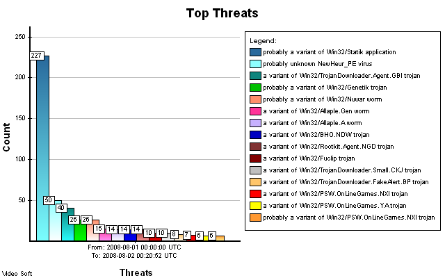 horas. Estos datos son capturados en una red de monitoreo propia, implementada por Video Soft desde setiembre de 2001, consistente en más de 100 casillas de correo testigo, con varios dominios, que reciben mensajes de varias listas de correo, páginas de ofertas, y simple correo basura. Estas cuentas son filtradas y solo se tiene en cuenta la existencia o no de código vírico o potencialmente peligroso.