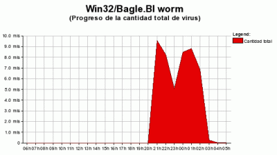 (http://www.virusradar.com/index_esn.html), el 8 de agosto de 2005, Bagle.BI trepó al primer puesto con más de 47,000 mensajes reportados en tan solo unas pocas horas, y un total de más de 148,000 desde su primera detección (26 de junio de 2005).