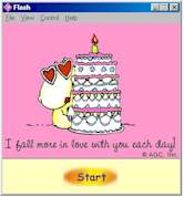 Si el adjunto es abierto, se nos presenta una ventana típica de una presentación realizada con la utilidad Macromedia Flash, conteniendo la imagen de una caricatura con fondo rosa, y una gran torta de cumpleaños, y al pie, el siguiente texto: